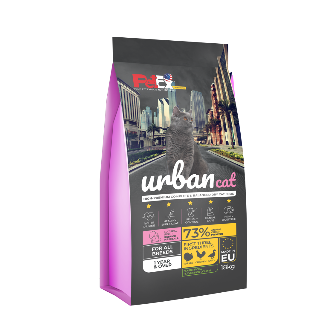 מזון יבש פטקס אורבן קט מכיל נתחי בשר איכותיים, דגנים, ירקות וסיבים תזונתיים המסייעים בעיכול, לצד תוספים חשובים לבריאות מערכת החיסון. כל מנה מספקת תזונה מאוזנת ומלאה, עם רמות אנרגיה המותאמות לאורח חיים בוגר ושקט
